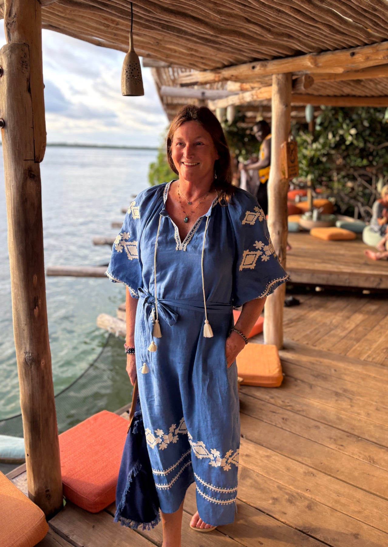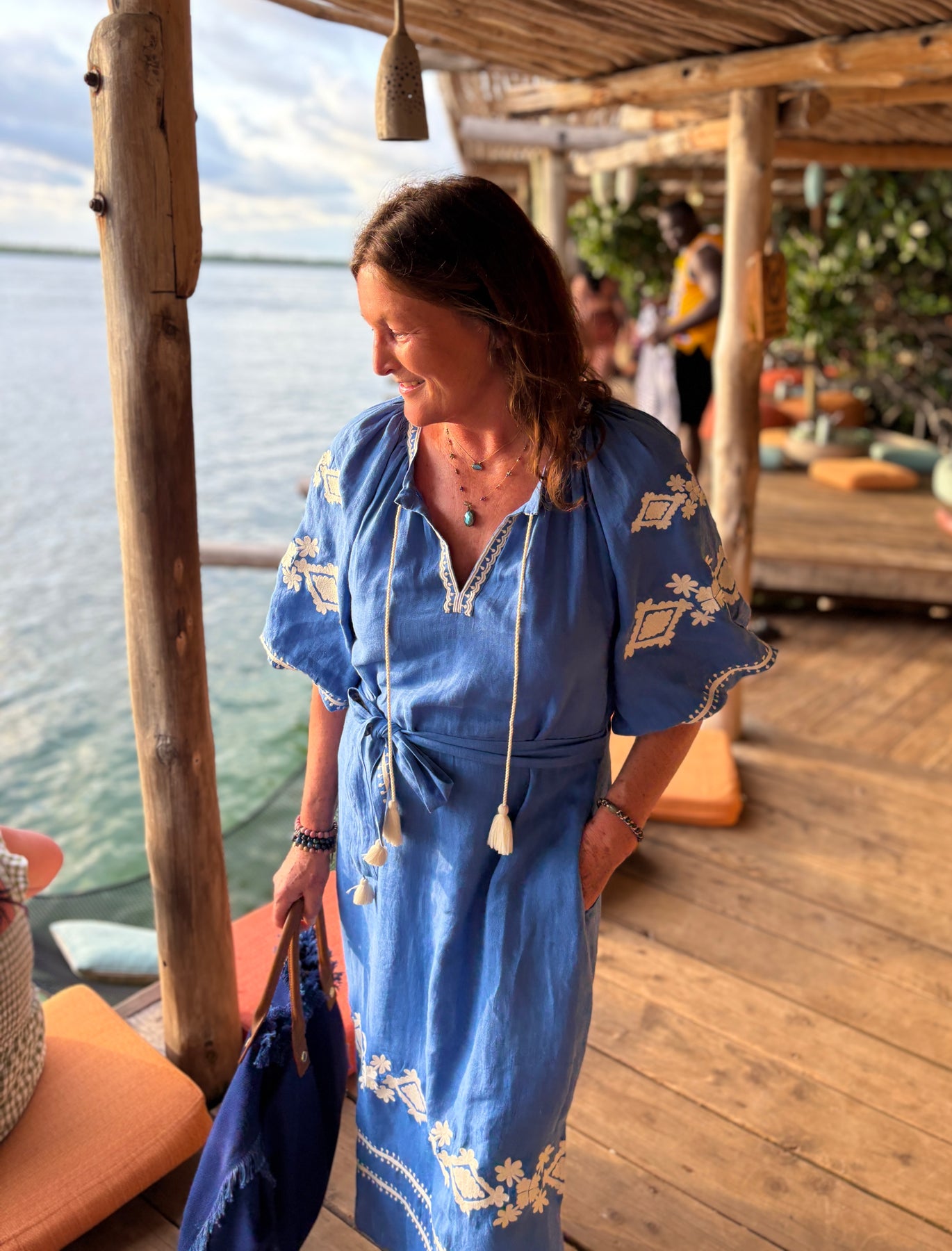 A beautiful royal blue dress or kaftan with the most intricate details. This dress is completely hand embroidered by a family run business in India. Tailored to KayaNuka as we have chosen the colours, embroideries & compositions. This blue is so striking and the embroidery on this one has such a cool, boho-chic feel.