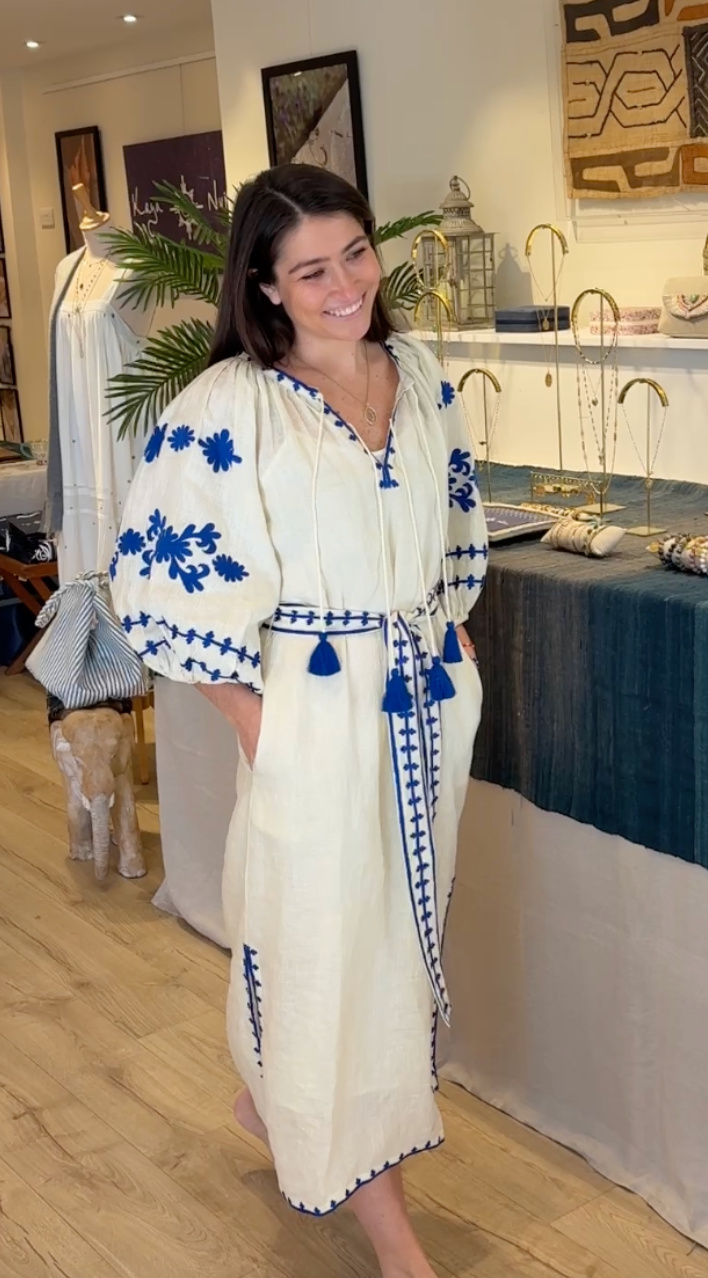 Featuring intricate blue embroidery on natural ecru linen, a relaxed silhouette, and tassel detailing, this dress is lightweight, breathable, and easy to wear.