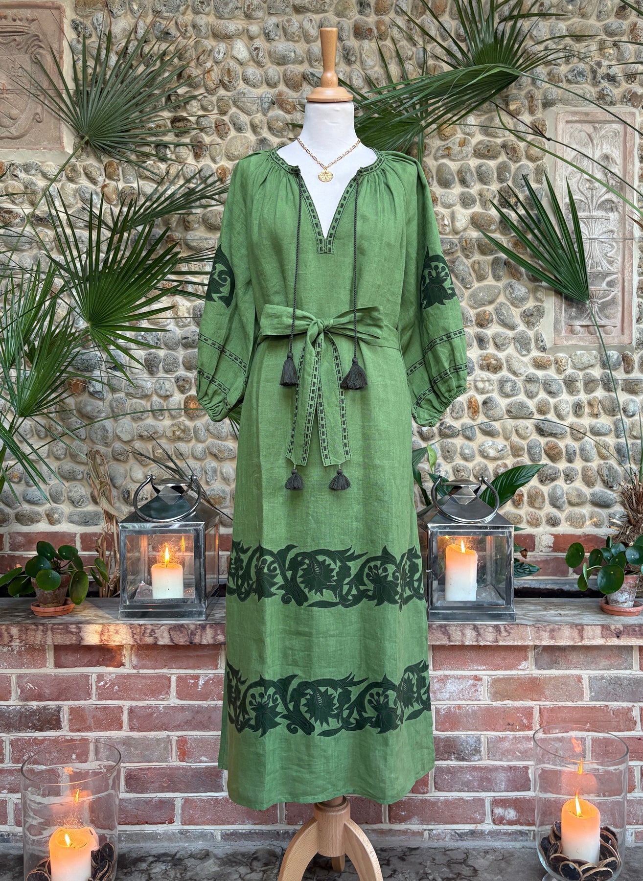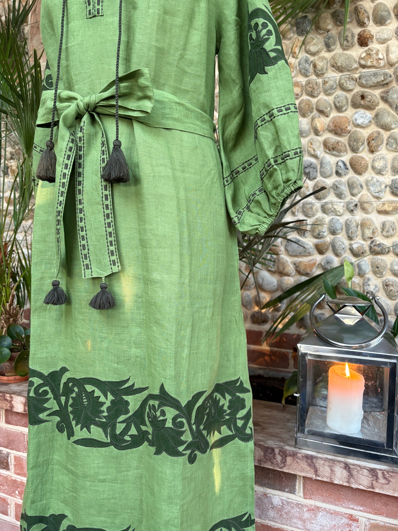 A beautiful olive green, hand embroidered linen dress! Featuring elegant puff sleeves with a belted waist! Elegant, sophisticated and easy to wear! Dress up or down!