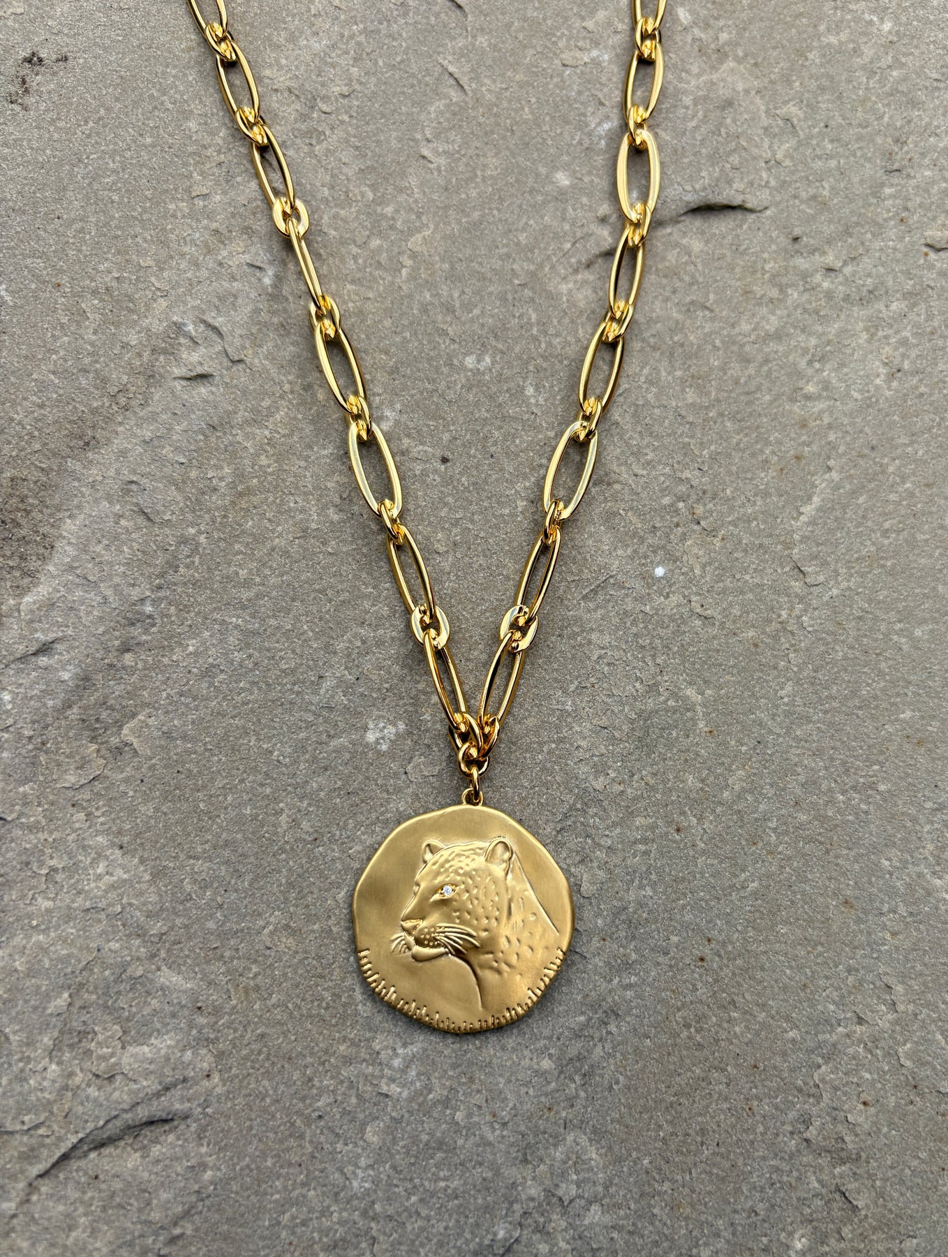 A stand out piece! A beautiful link chain necklace carrying a hand engraved panther head on the medallion. A piece that will carry you through the seasons and will be worn again & again!