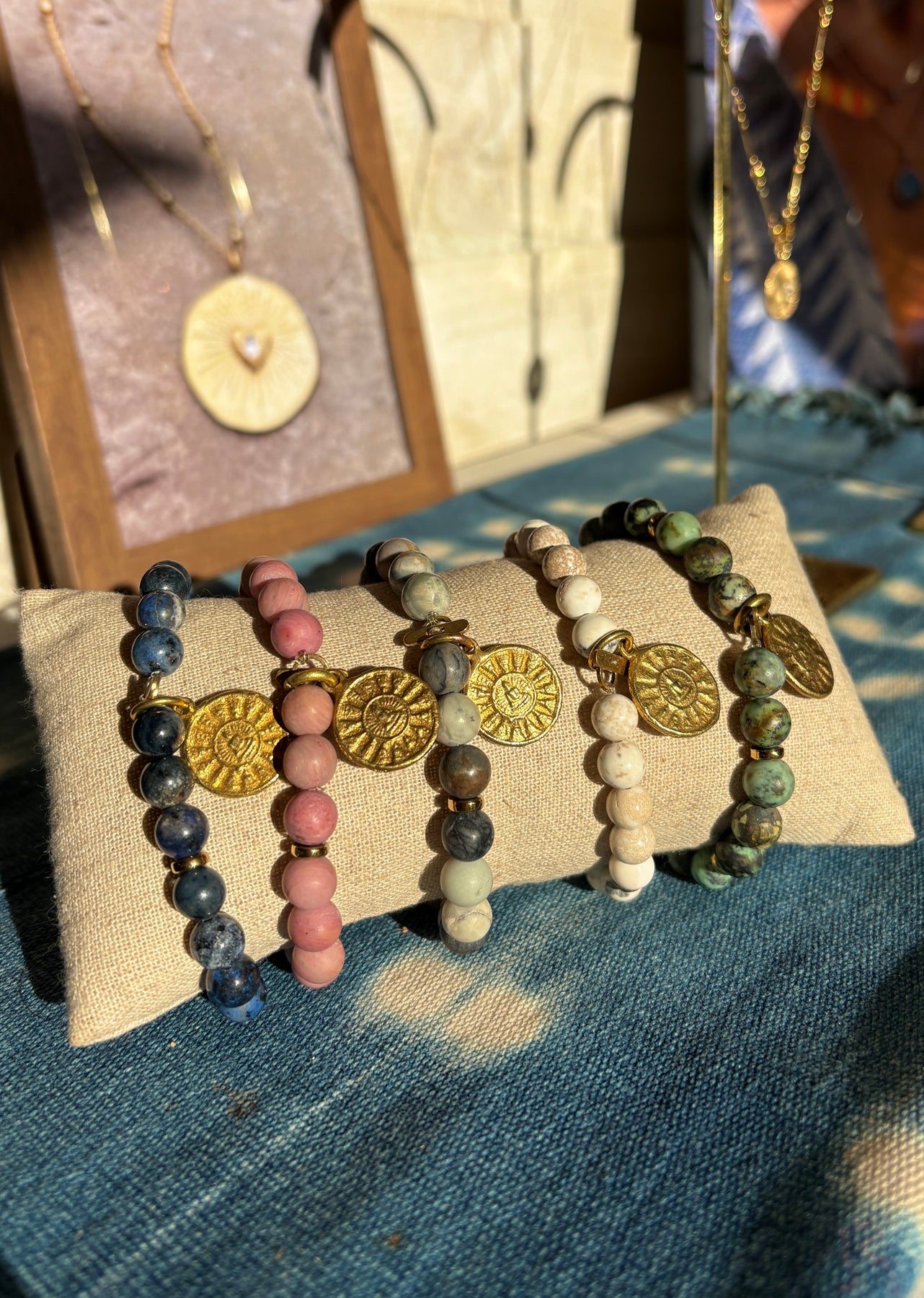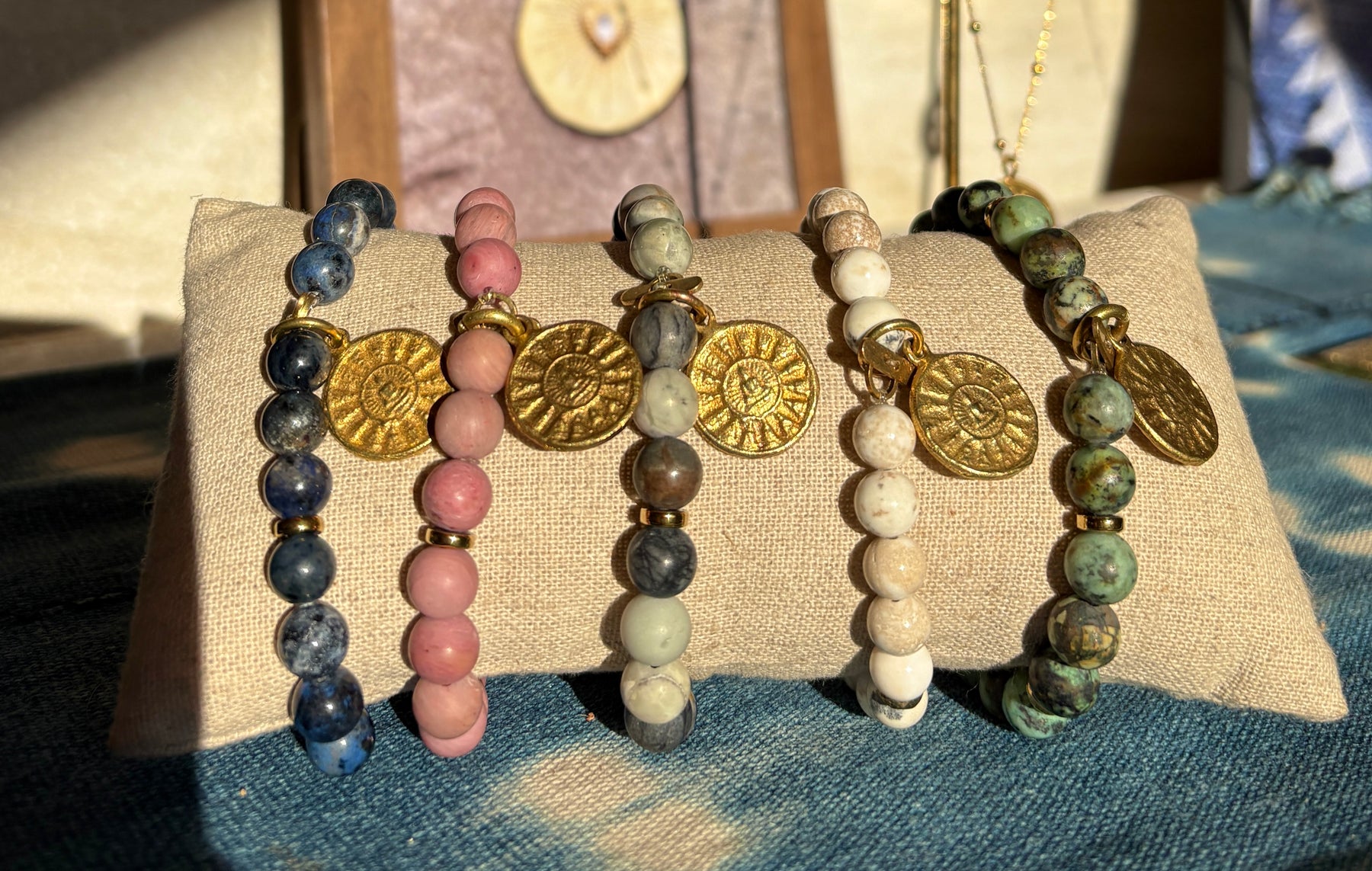 Available in 5 colours. A perfect boho-chic bracelet for everyday! Featuring natural stones such as... Rhodonite (Pink), Howlite (white), African Turquoise (green), Picasso Jasper (stone) & Dumortierite (Navy Blue). All on a strong elastic band with a beautifully hand engraved sun/buddha medallion. 24k gold plate on recycled tin. Produced in small quantities & supporting a small run family business. Bespoke to KayaNuka.