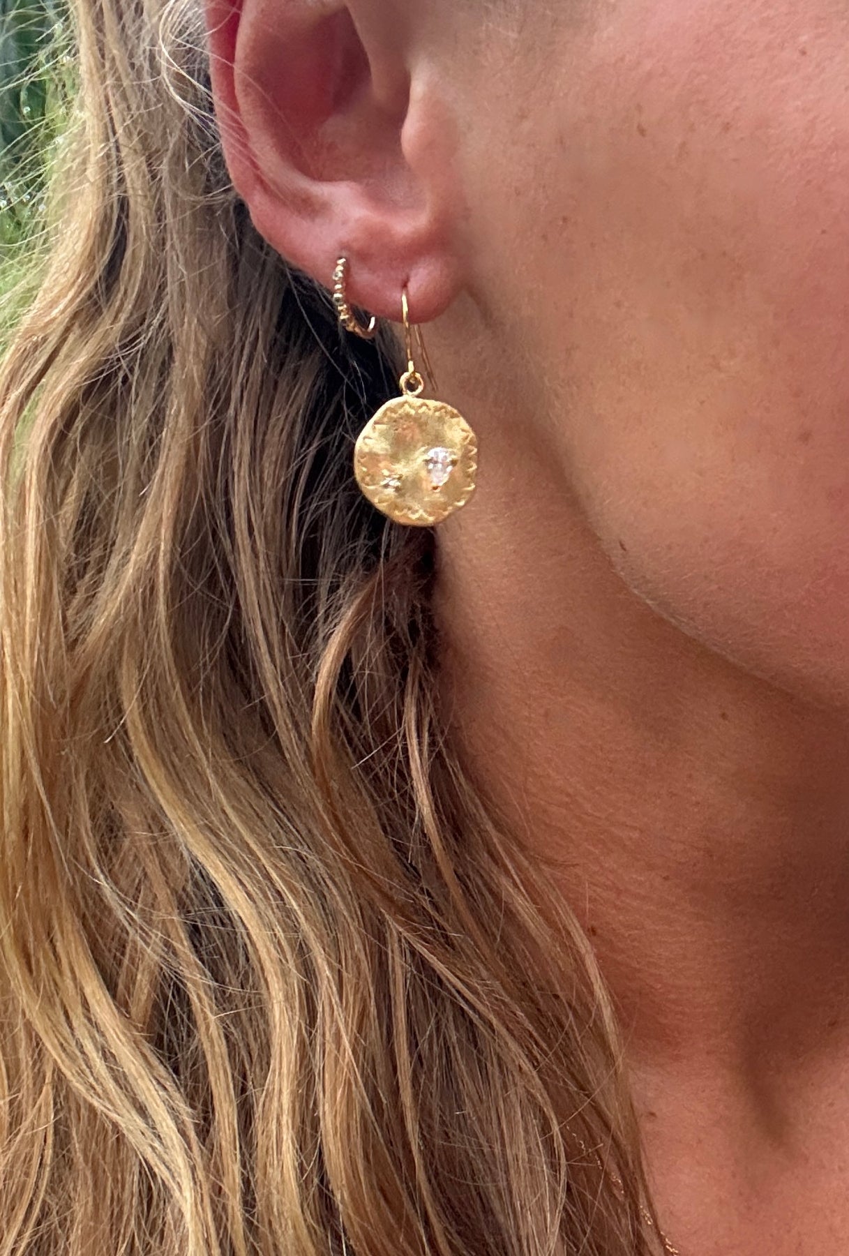 These gorgeous earrings are the same design as the best selling Gala necklace. Featuring a hand beaten disc with embedded white cubic zirconia stones.