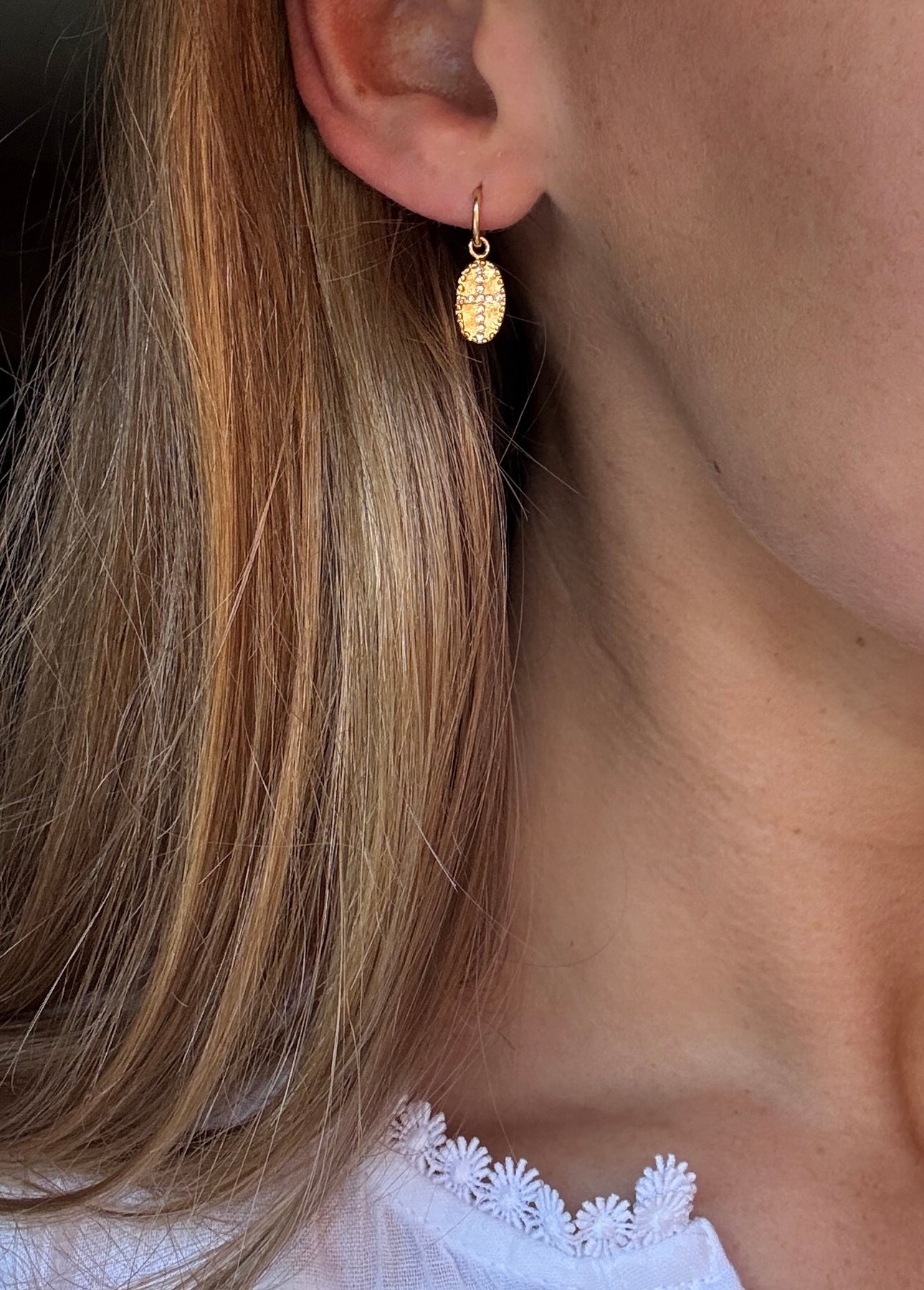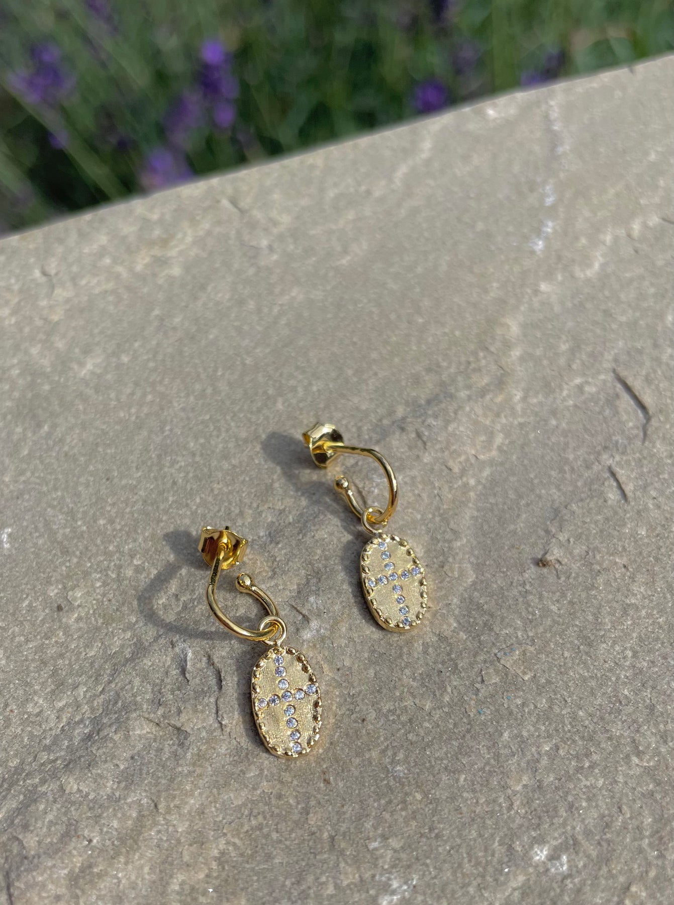 The perfect addition to your jewellery collection! These chic & stylish huggie earrings feature a rough gold finish & a bohemian rock chic identity design with hand embedded white cubic zirconia stones.