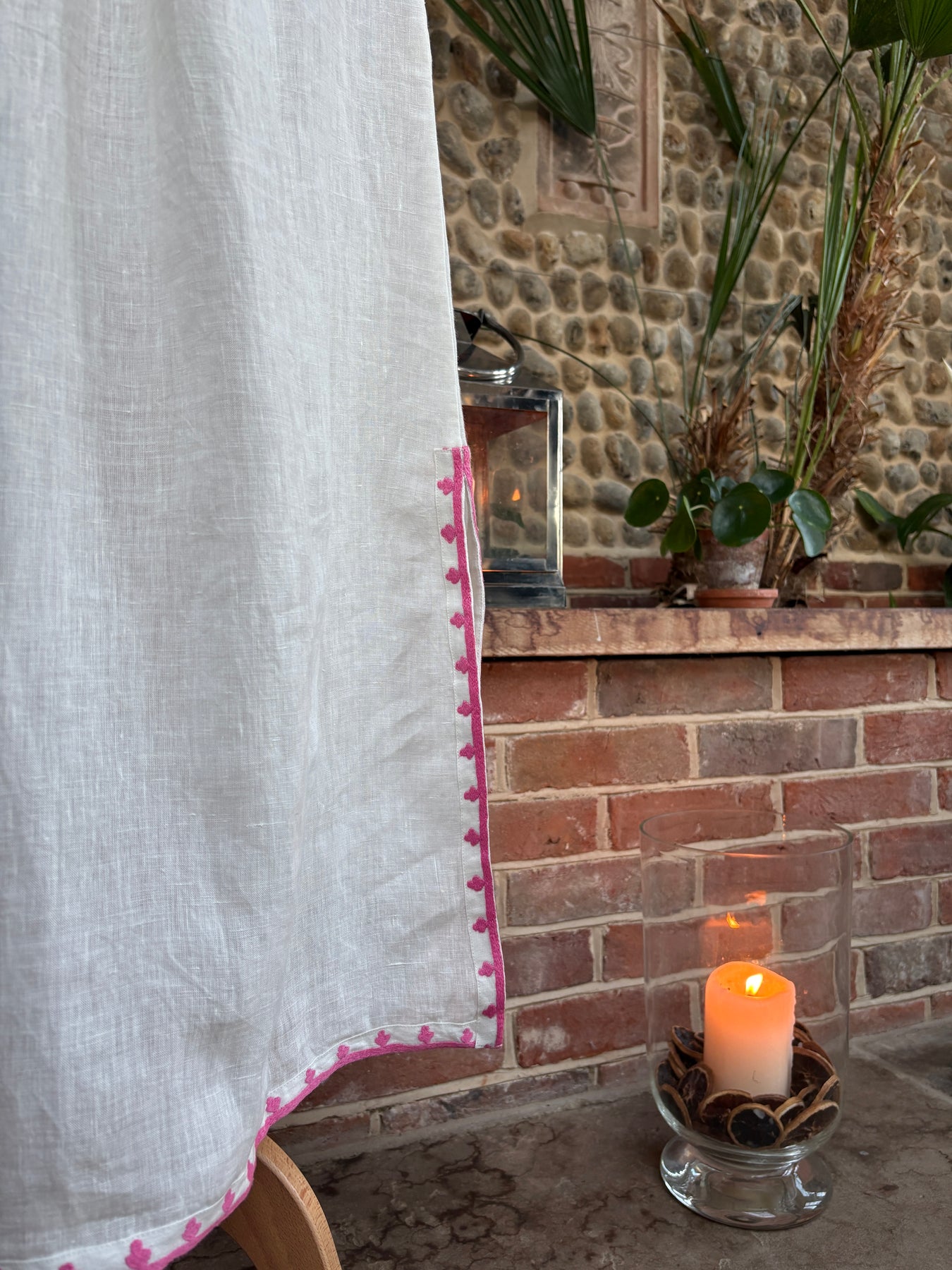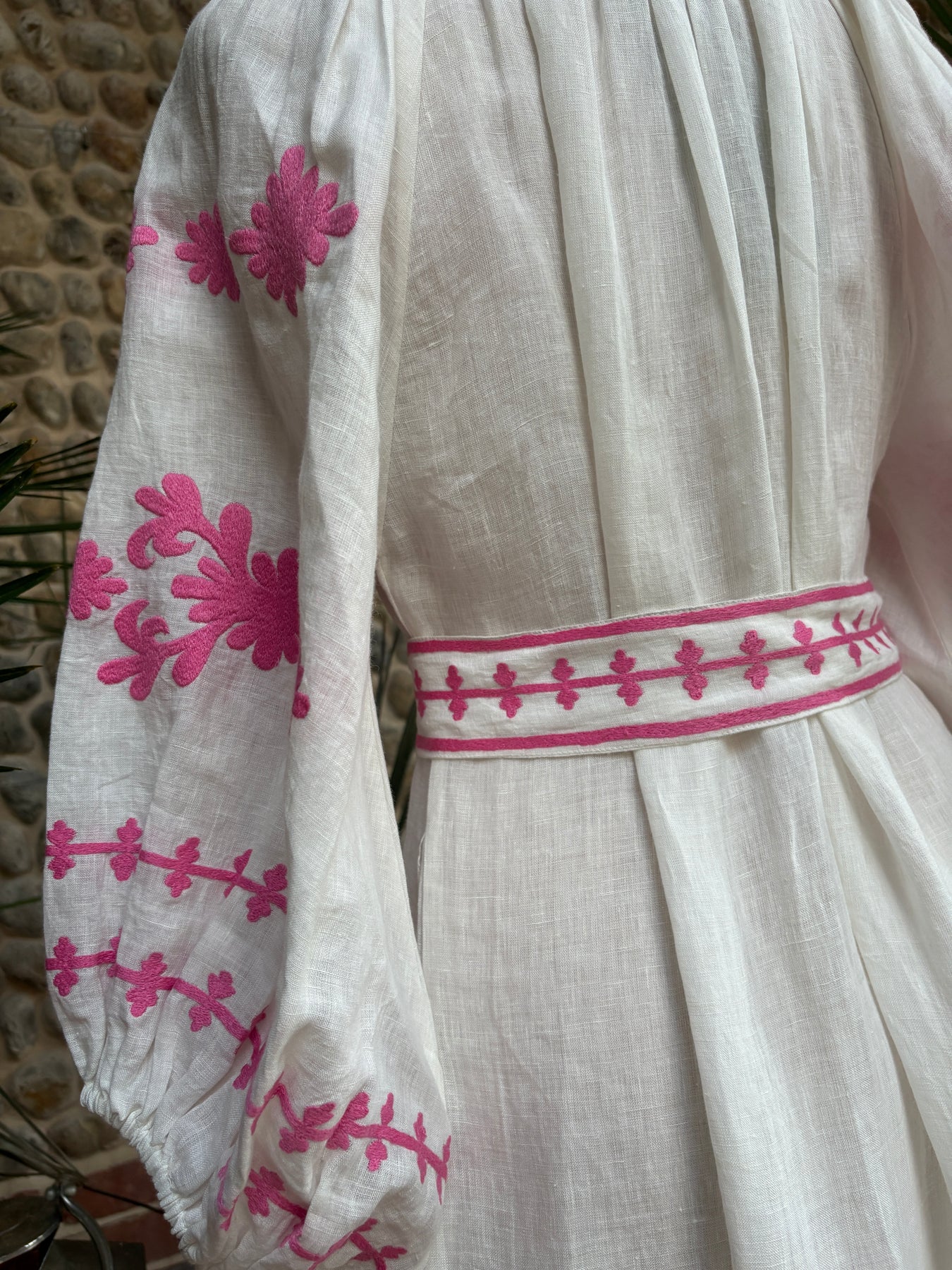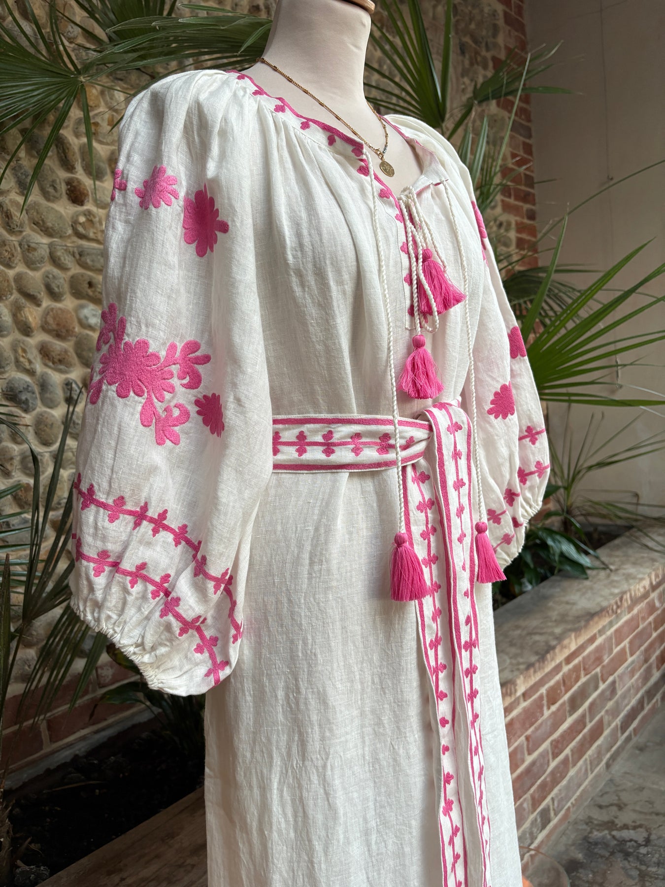 Featuring intricate pink embroidery on natural ecru linen, a relaxed silhouette, and tassel detailing, this dress is lightweight, breathable, and easy to wear.