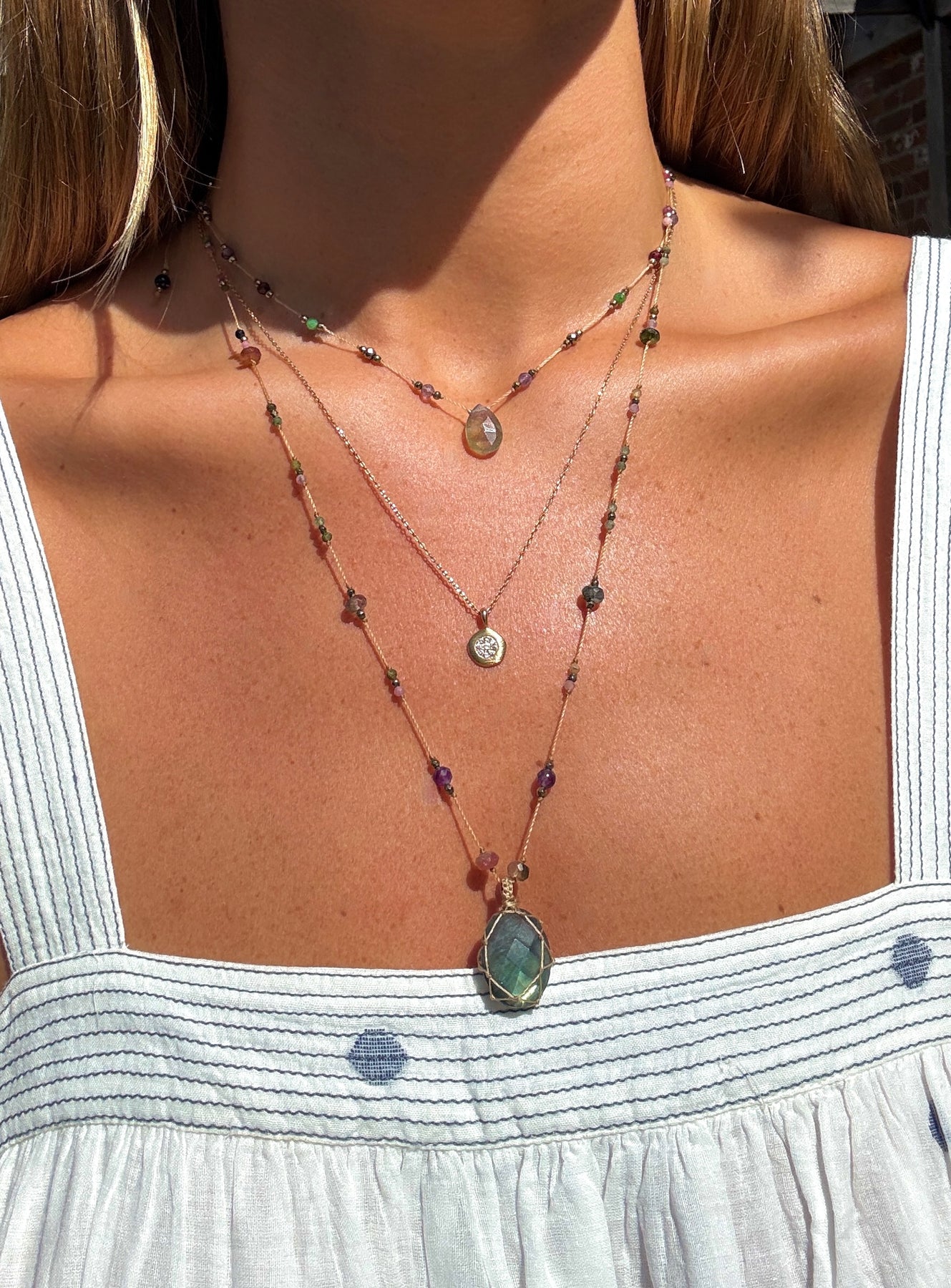 Handmade in a small artisan workshop in India. Each necklace is carefully assembled using natural stones and delicate beads, mounted on transparent fishing line to create a light, floating effect when worn. The result is a refined and contemporary piece that highlights the beauty of natural stones. Every necklace is unique due to the natural variations of the stones.